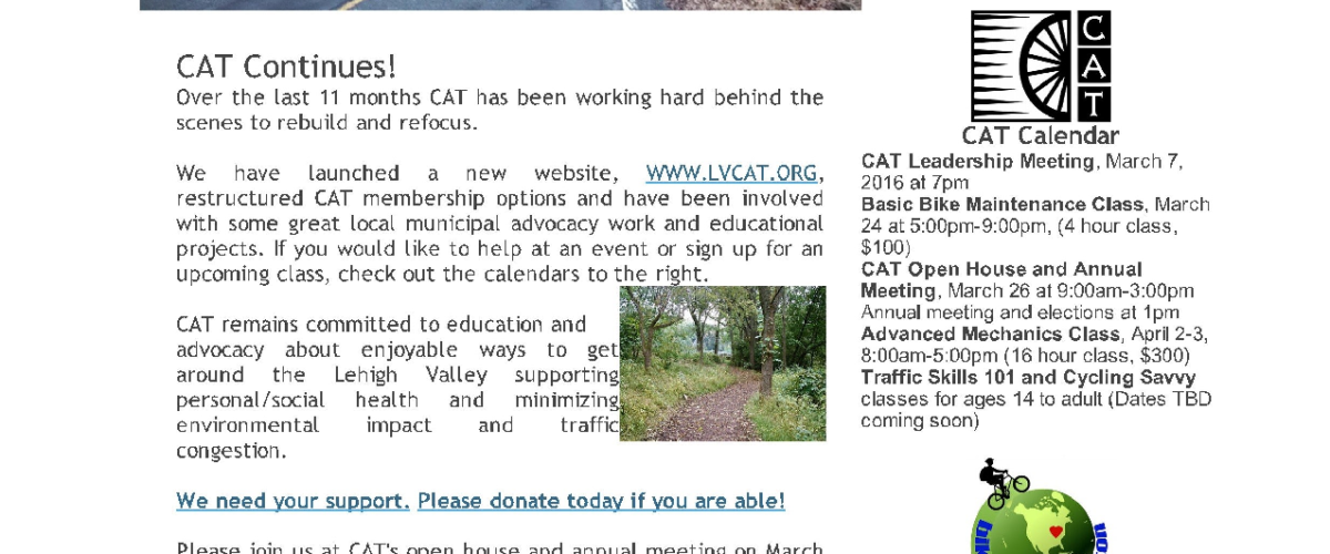 —-All visits are by appointment. Please contact us by phone 610-954-5744, email (cat@lvcat.org), or Facebook messenger to schedule your visit to volunteer or work on your bike project.