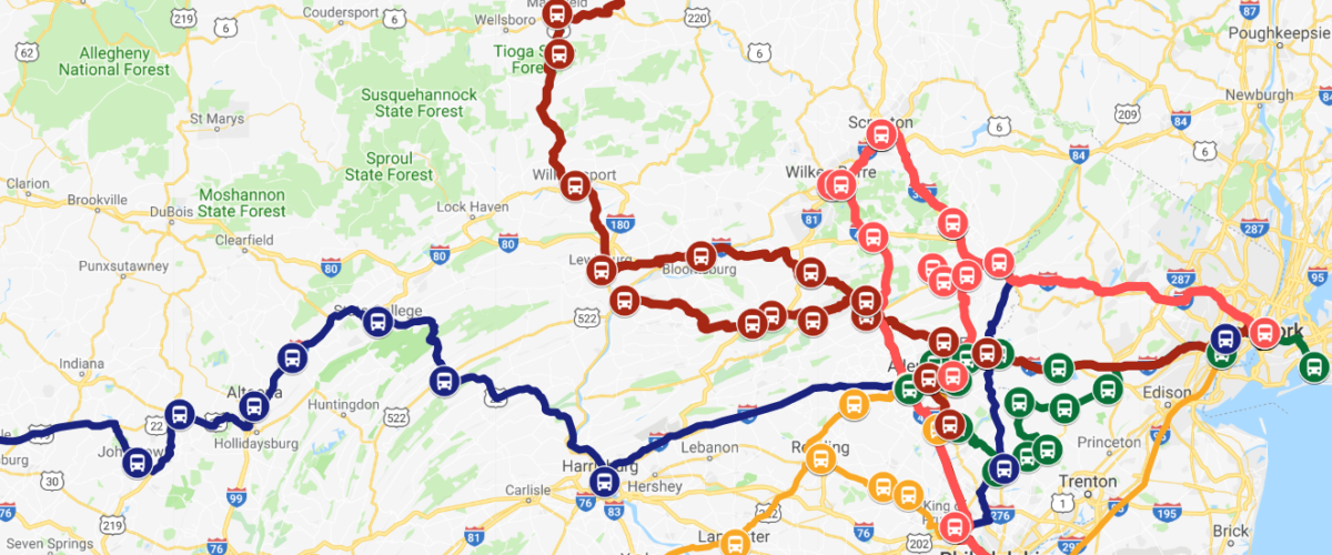 Contacts with various groups (American Bus Association, Pennsylvania Bus Association and Greater New Jersey Motorcoach Association) have bus company member listings, but no system-wide map of service routes, which in my opinion could really help travelers.